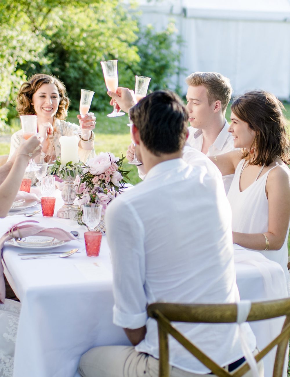 Danach setzt sich das frisch verheiratete Paar mit seinen Freunden an einen wunderschön gedeckten Tisch, stößt auf die Hochzeit an und genießt den Abend so wie es am angenehmsten ist – als Family Style Dinner.