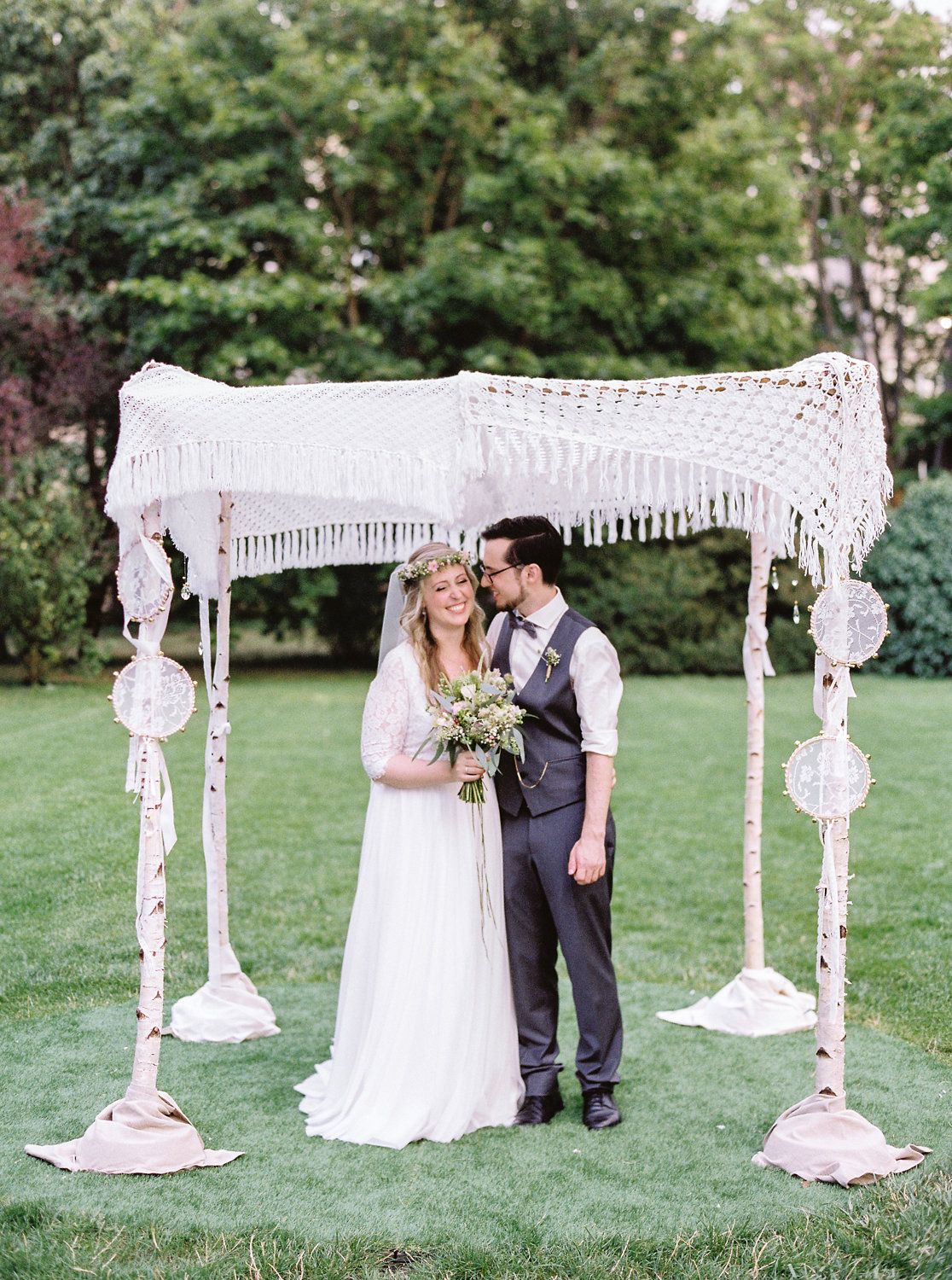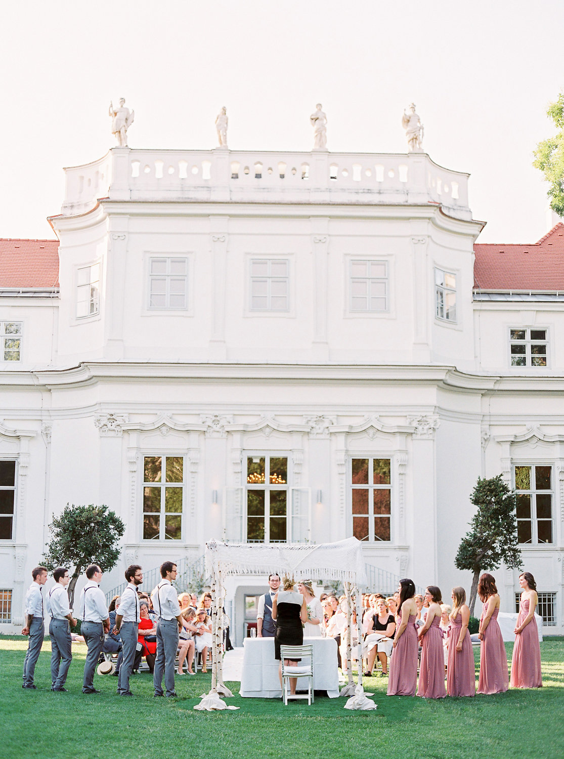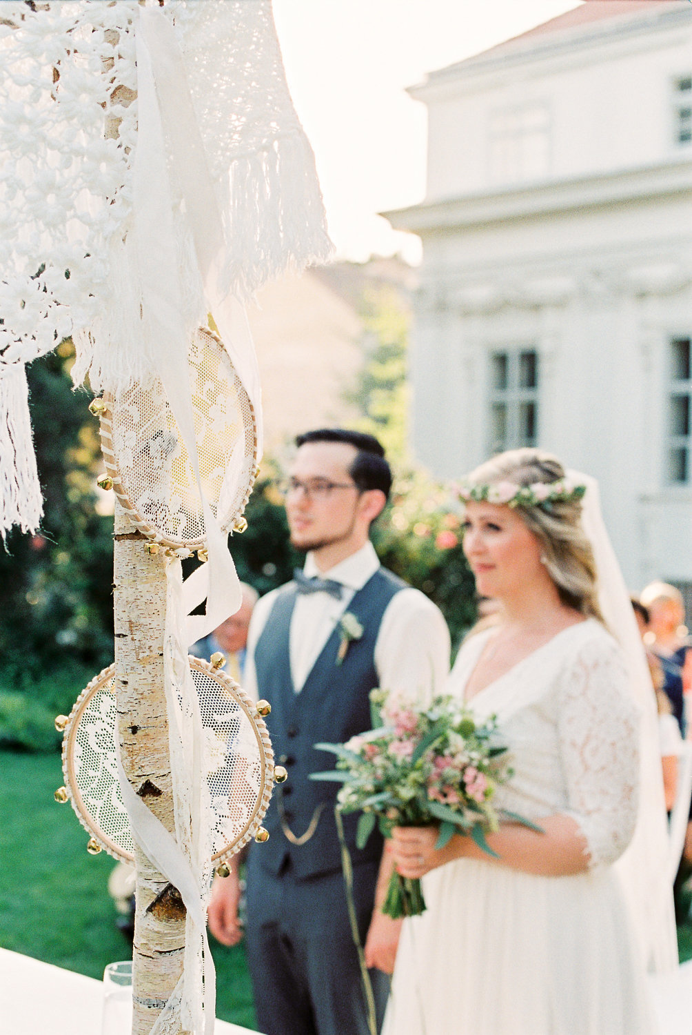 Duftige Blumen in zart-pastelligen Farben und mein Baldachin aus Birkenstämmen mit romantischem Boho-Himmel bilden den Rahmen für die Trauung im Park des majestätischen Palais Schönburg in Wien.