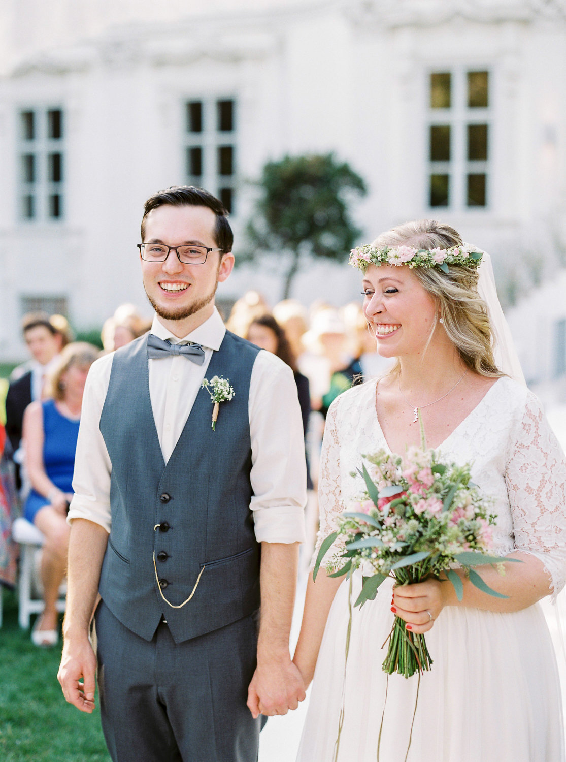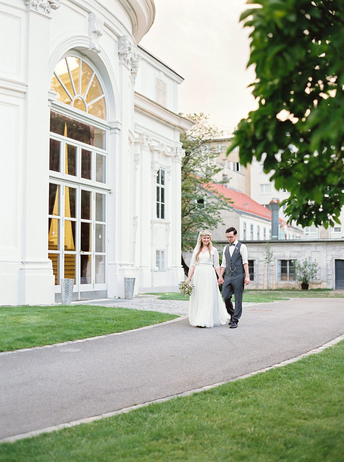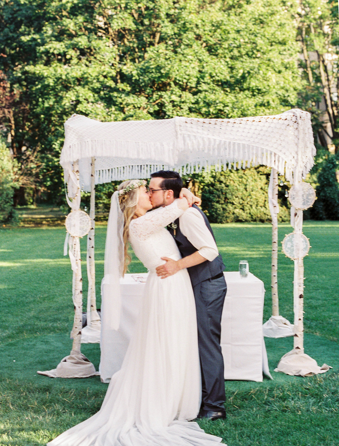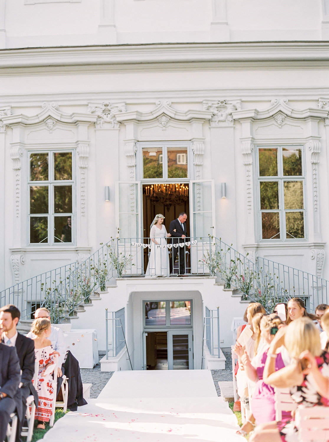 Duftige Blumen in zart-pastelligen Farben und mein Baldachin aus Birkenstämmen mit romantischem Boho-Himmel bilden den Rahmen für die Trauung im Park des majestätischen Palais Schönburg in Wien.
