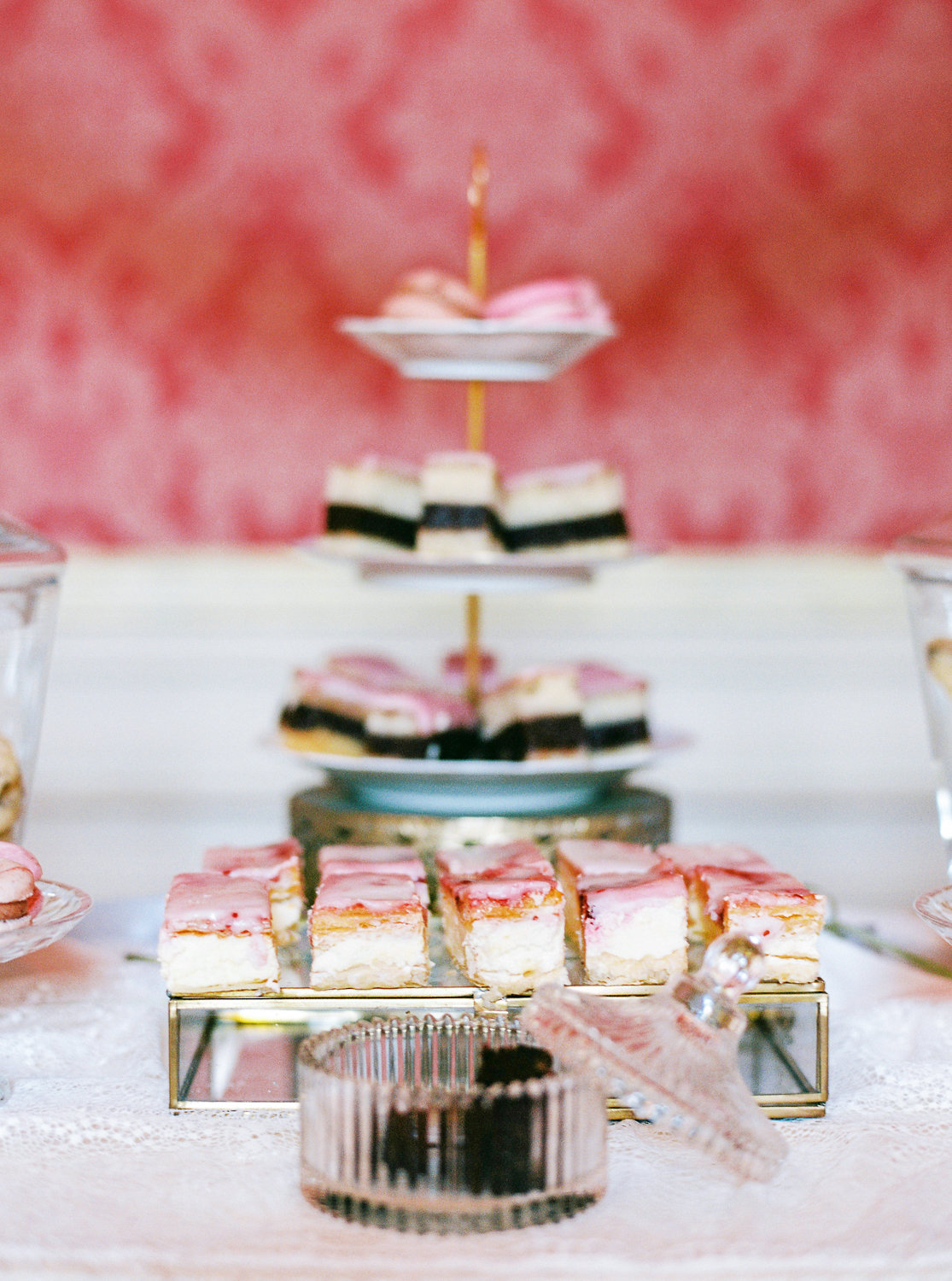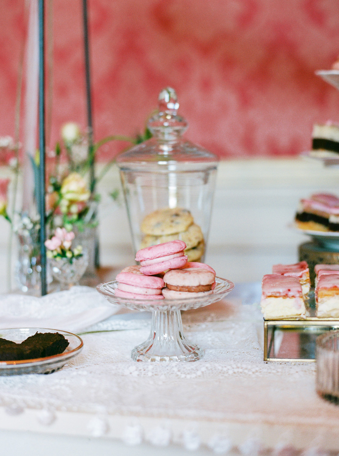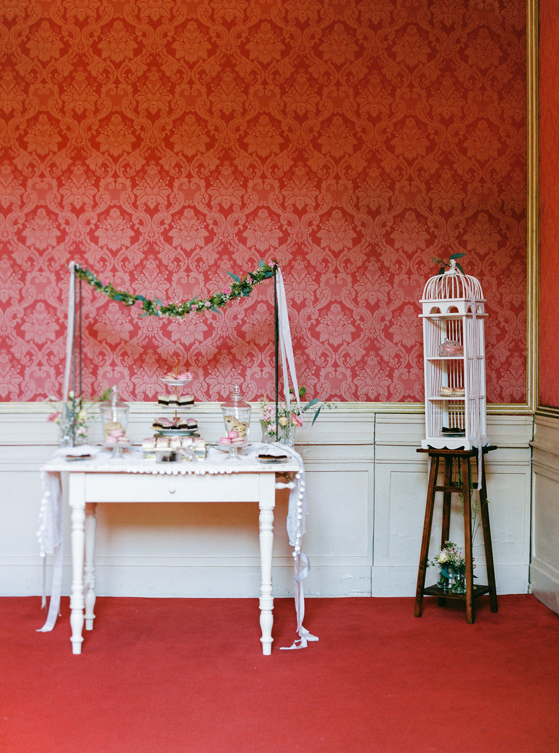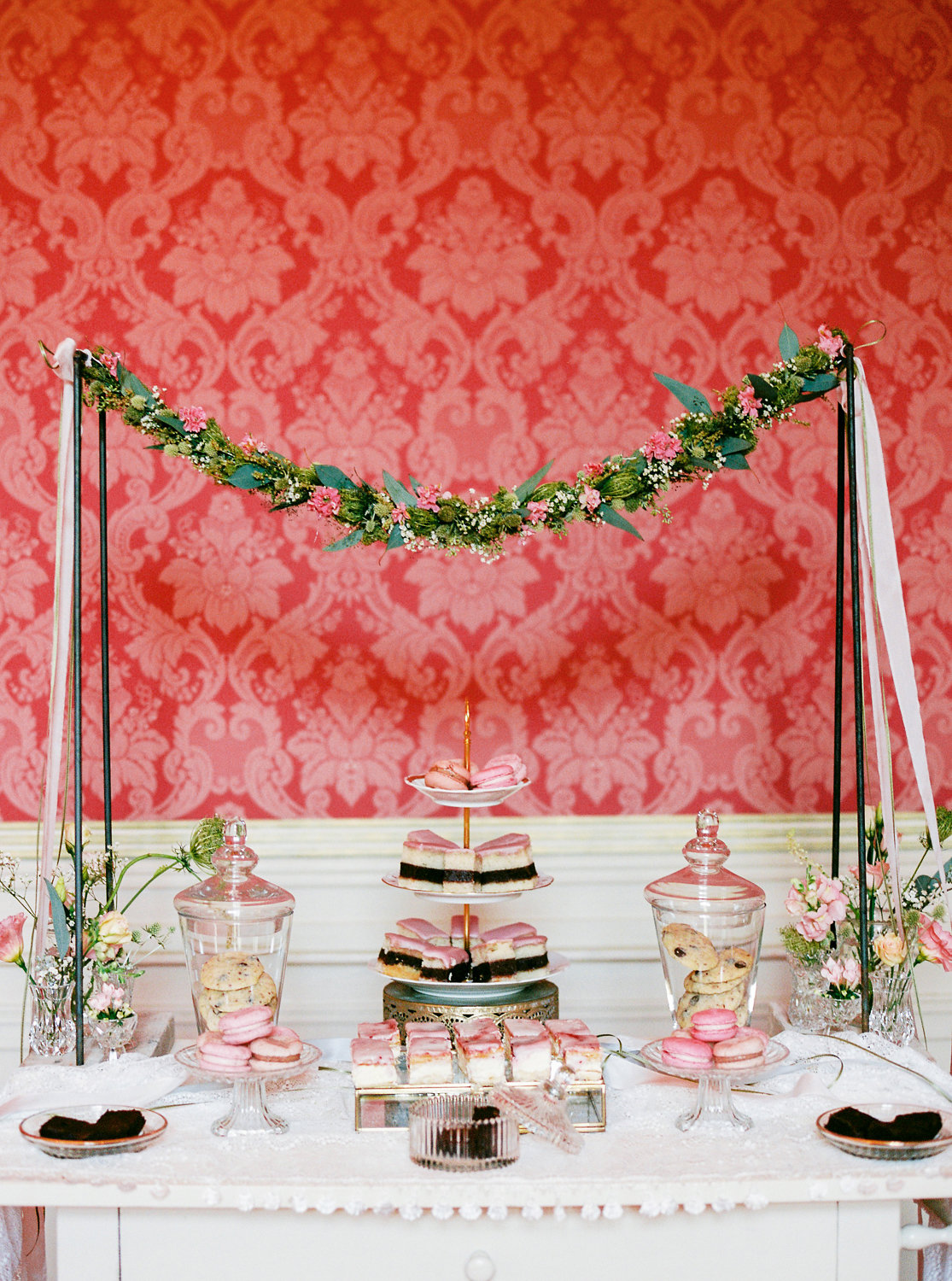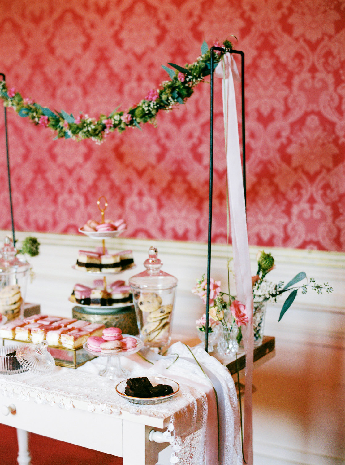 Einer der Hingucker dort ist der süße kleine Sweet Table – mit Blumengirlande und wunderschönen Gefäßen, Tellern & Schalen, in denen ich die leckeren Köstlichkeiten für die Gäste ansprechend präsentiert habe.