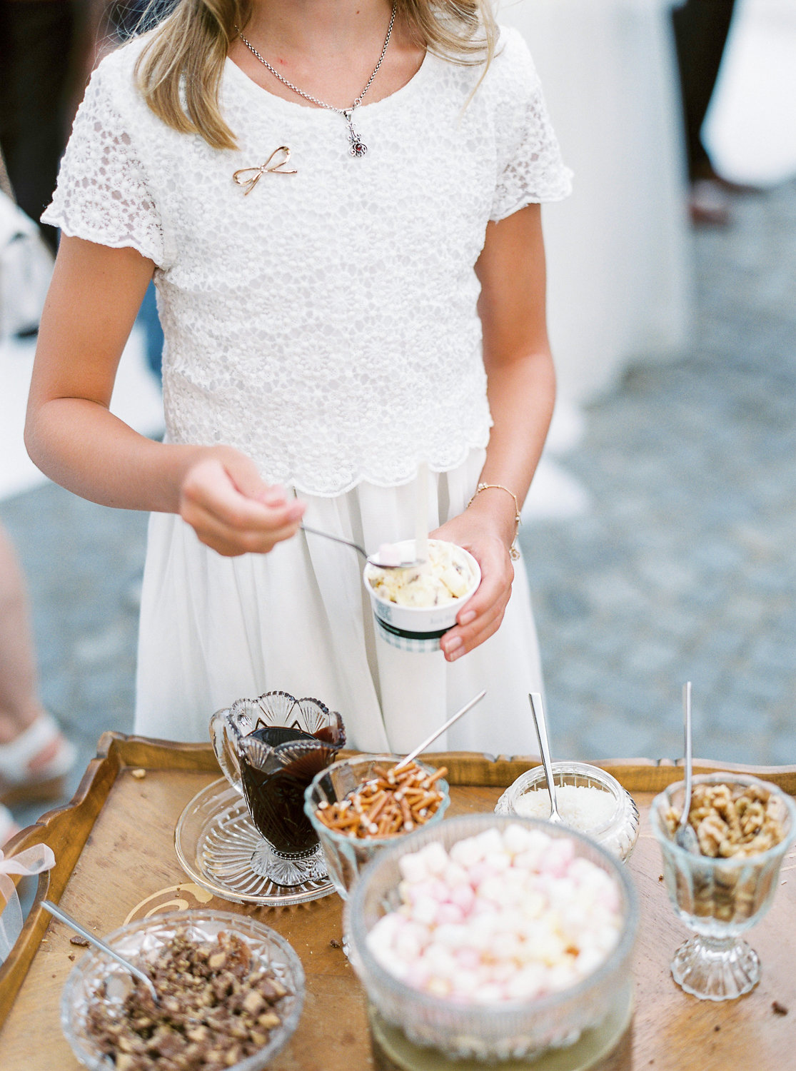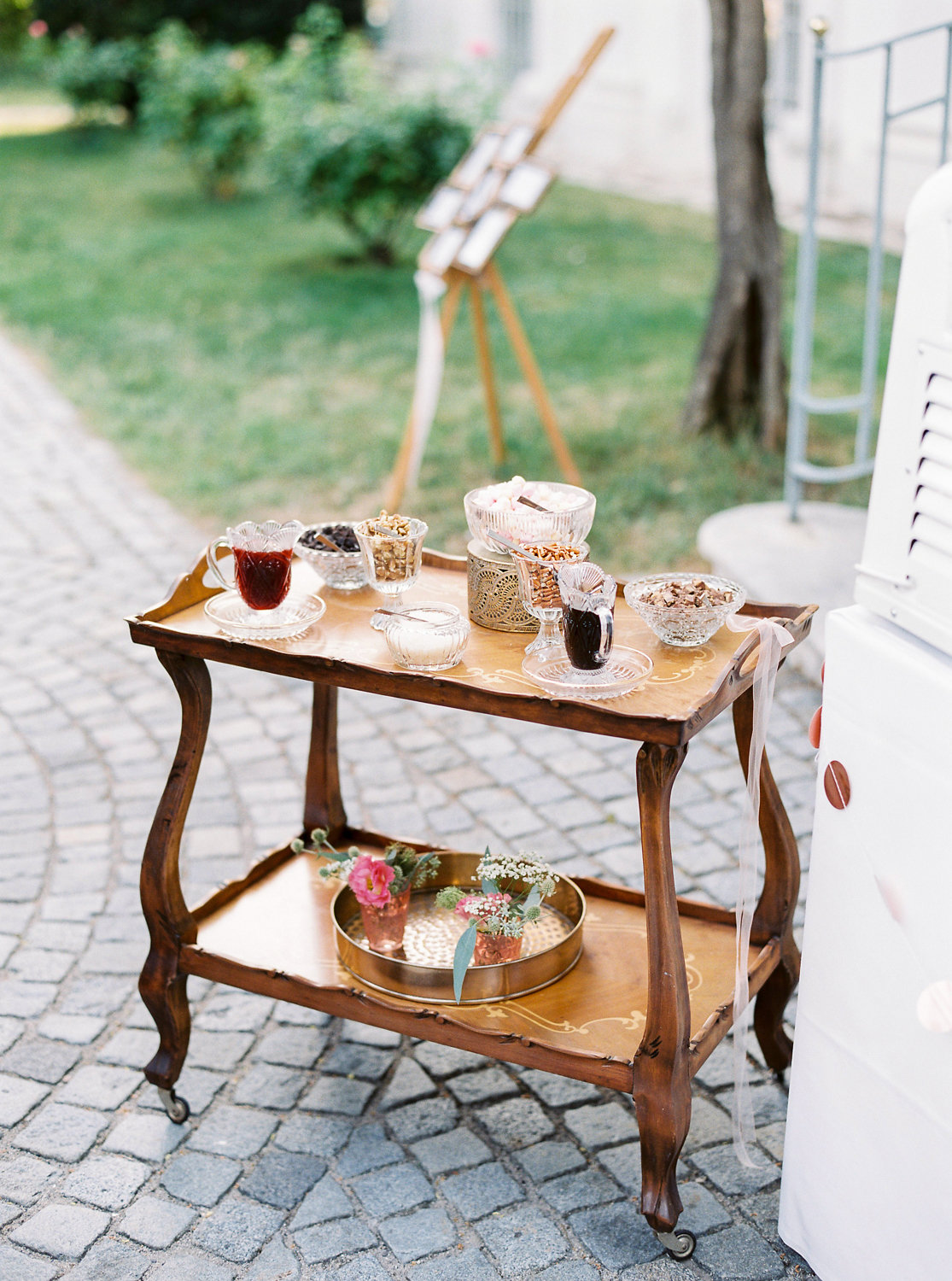 Abkühlen können sich die Gäste draußen bei der Agape mit Eis – dazu gibt es eine Menge unterschiedlicher Toppings, die ich auf einem antiken Servierwagen angerichtet habe.