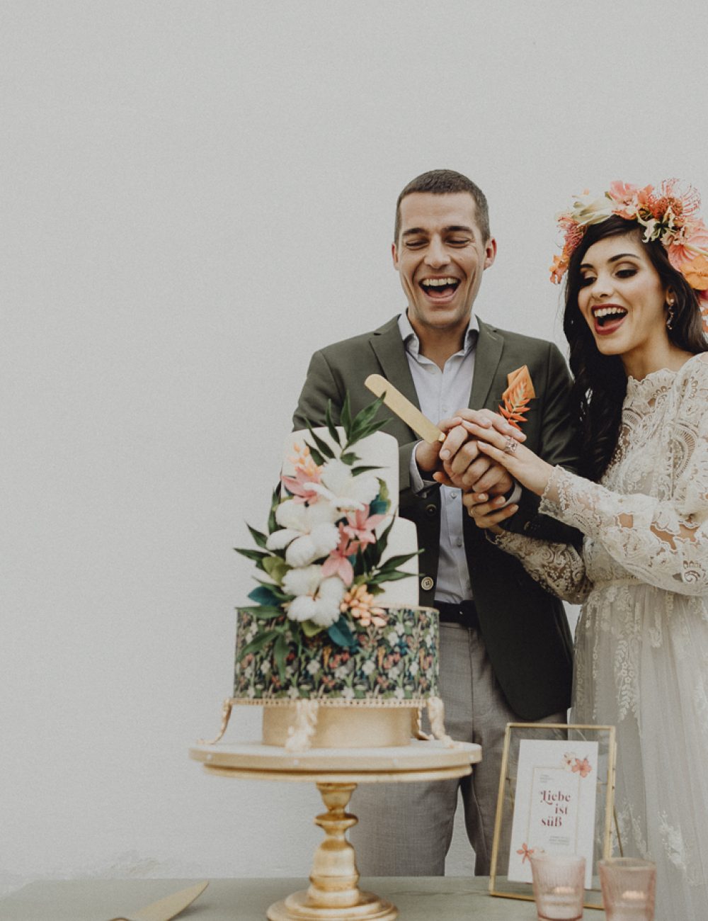 Farbenpracht am Tisch und üppige Dekoration am Traubogen – es ist eine faszinierende Hochzeit im städtischen Dschungel. Was in einem fernen exotischen Land fotografiert sein könnte, liegt in Wahrheit ganz nah. Schloss Hof in Niederösterreich als ausgefallener Rahmen für eine exotische Hochzeits-Inspiration: Blumen, Farben und Muster erinnern uns an ferne Reisen, an eine tropische Flora, die es hier bei uns nicht gibt…