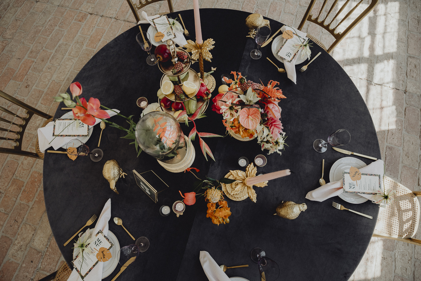 Farbenpracht am Tisch und üppige Dekoration am Traubogen – es ist eine faszinierende Hochzeit im städtischen Dschungel. Was in einem fernen exotischen Land fotografiert sein könnte, liegt in Wahrheit ganz nah. Schloss Hof in Niederösterreich als ausgefallener Rahmen für eine exotische Hochzeits-Inspiration: Blumen, Farben und Muster erinnern uns an ferne Reisen, an eine tropische Flora, die es hier bei uns nicht gibt…